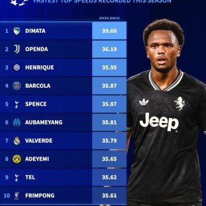 1月22日讯 德国转会市场盘点了本赛季欧冠赛场上最快速度球员,帕福斯的迪马塔以39.6KM/H居首,尤文的奥蓬达和国米的...
