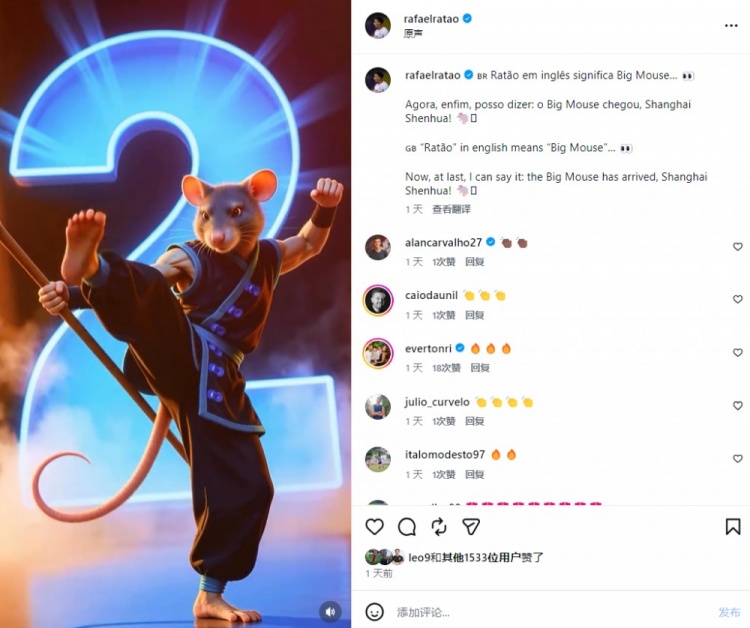 01月 17 2026 0 申花新援拉唐晒图调侃自己绰号:“大老鼠”抵达上海申花! xiaoqiao 2026-01-17 西甲 65 1月3日讯 元旦当天,申花官方宣布了前大阪樱花前锋拉斐尔·拉唐的加盟,球员上赛季斩获J1联赛银靴。今日拉唐在社媒晒出一张老鼠为主题的海报纪念自己加盟申花,他写道:“我的姓拉唐,其意为‘大老鼠’。现在我终于能够说出这句话:‘大老鼠抵达上海申花!’”